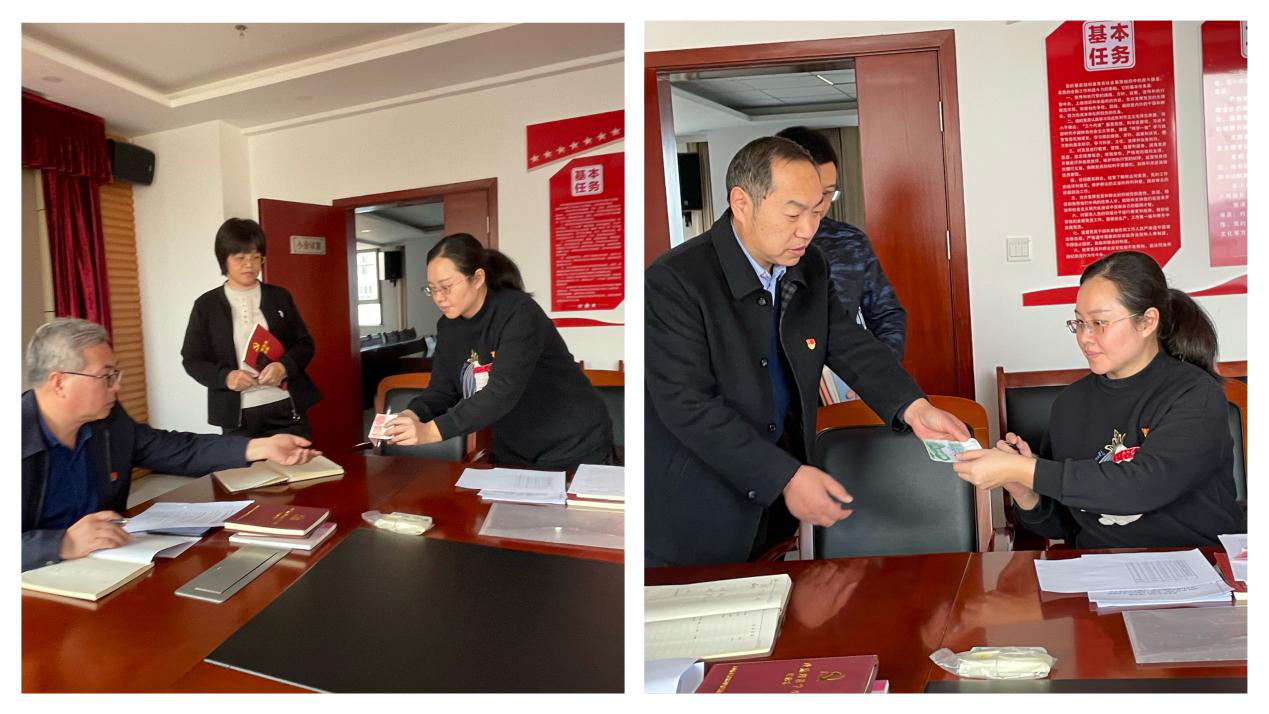在主題黨日上,黨員集中繳納了本月黨費,并在支部黨員大會記錄本和“三晉先鋒”軟件上簽到。