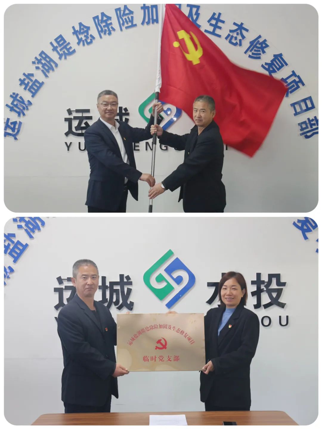 會議首先宣讀了公司黨委《關(guān)于同意成立運(yùn)城鹽湖堤埝除險(xiǎn)加固及生態(tài)修復(fù)項(xiàng)目臨時(shí)黨支部的批復(fù)》,黨委書記、副書記分別向臨時(shí)黨支部授旗、授牌,贈送了黨章、黨徽、黨建圖書、會議記錄本、學(xué)習(xí)資料等,并對鹽湖項(xiàng)目臨時(shí)黨支部的成立表示熱烈祝賀。