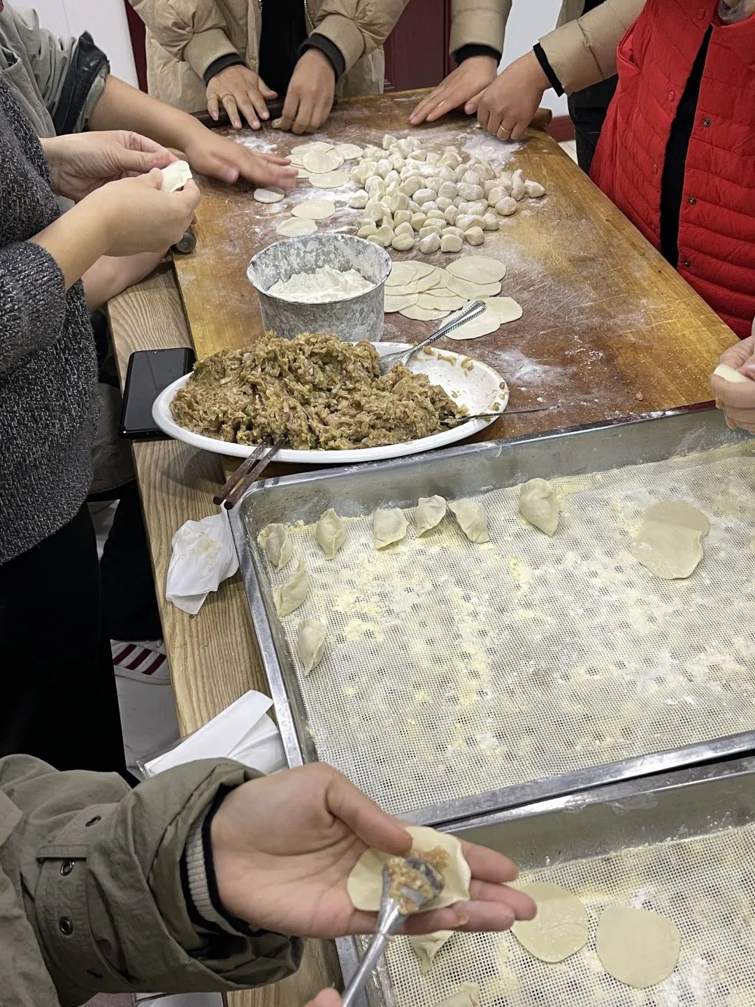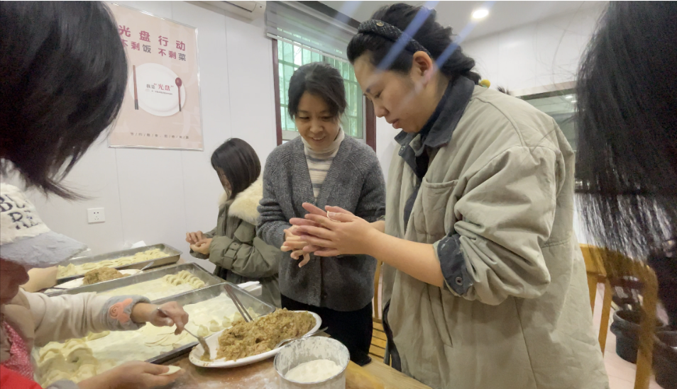 大家一起圍在桌旁,分工有序、忙而不亂,互相交流著包餃子的技巧,歡聲笑語中各個(gè)大顯身手,現(xiàn)場(chǎng)氣氛和諧,到處洋溢著“家”的味道、“家”的溫馨。一番協(xié)作之下,一排排個(gè)性十足的餃子很快就包好了,屋外寒風(fēng)陣陣,屋內(nèi)歡聲笑語,暖意融融。
