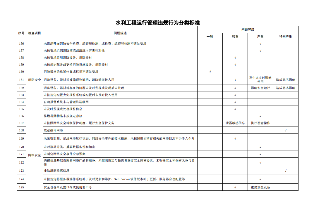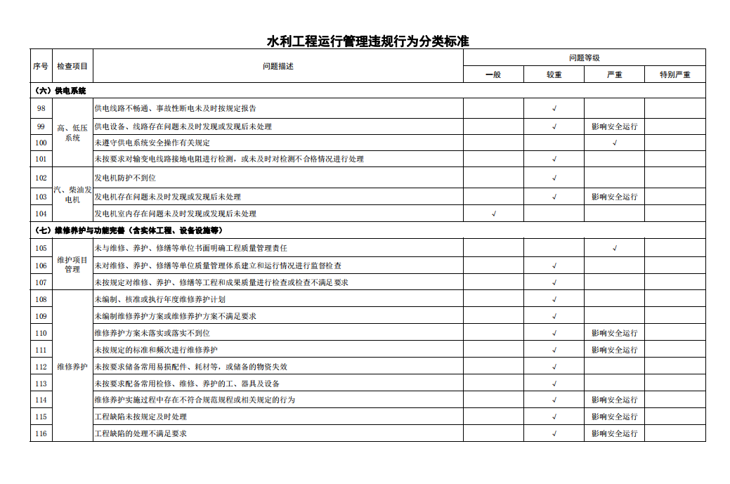 第十一條 對(duì)檢查發(fā)現(xiàn)的運(yùn)行管理問題按照運(yùn)行管理違規(guī)行為分類標(biāo)準(zhǔn)和工程缺陷分類標(biāo)準(zhǔn)進(jìn)行認(rèn)定。