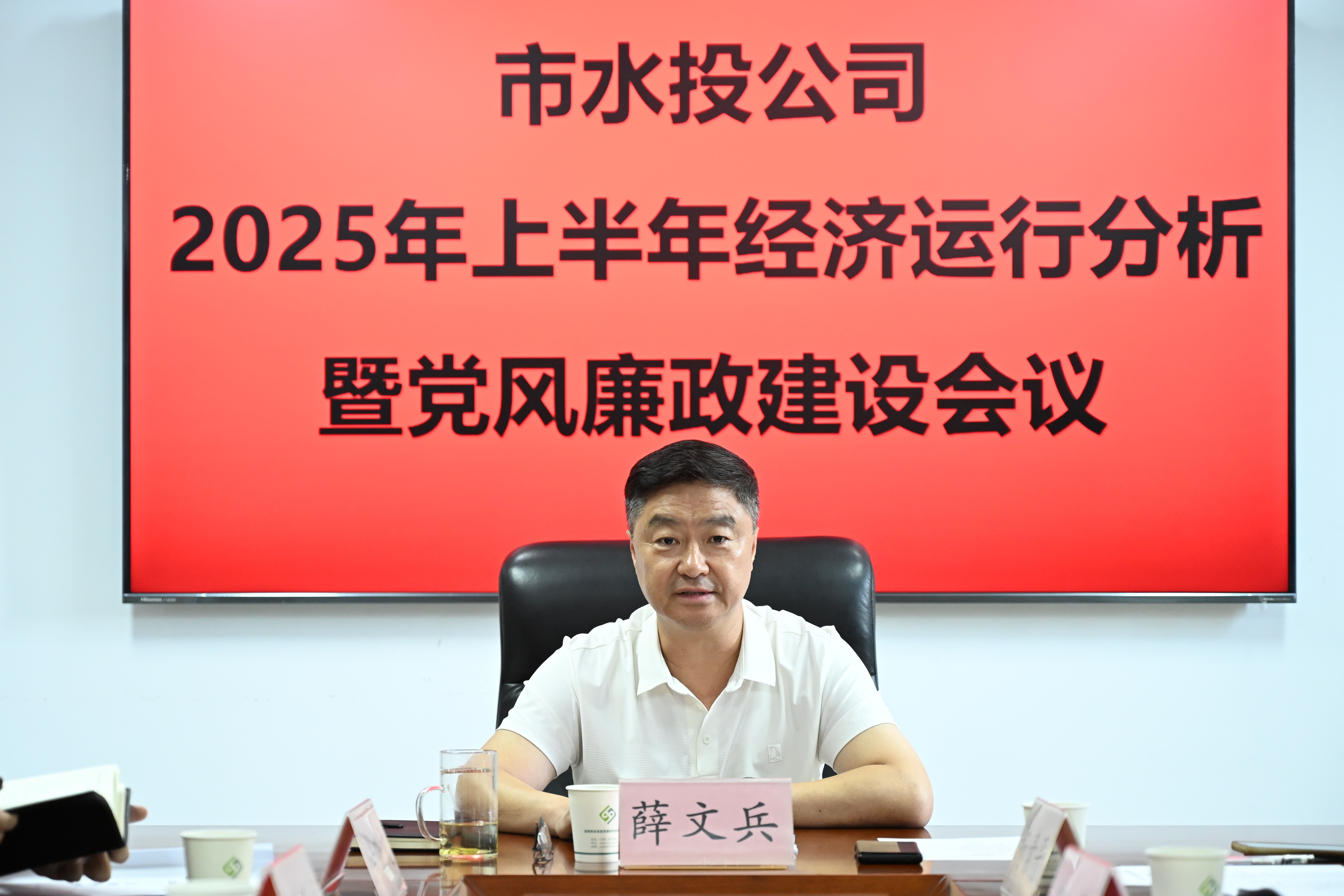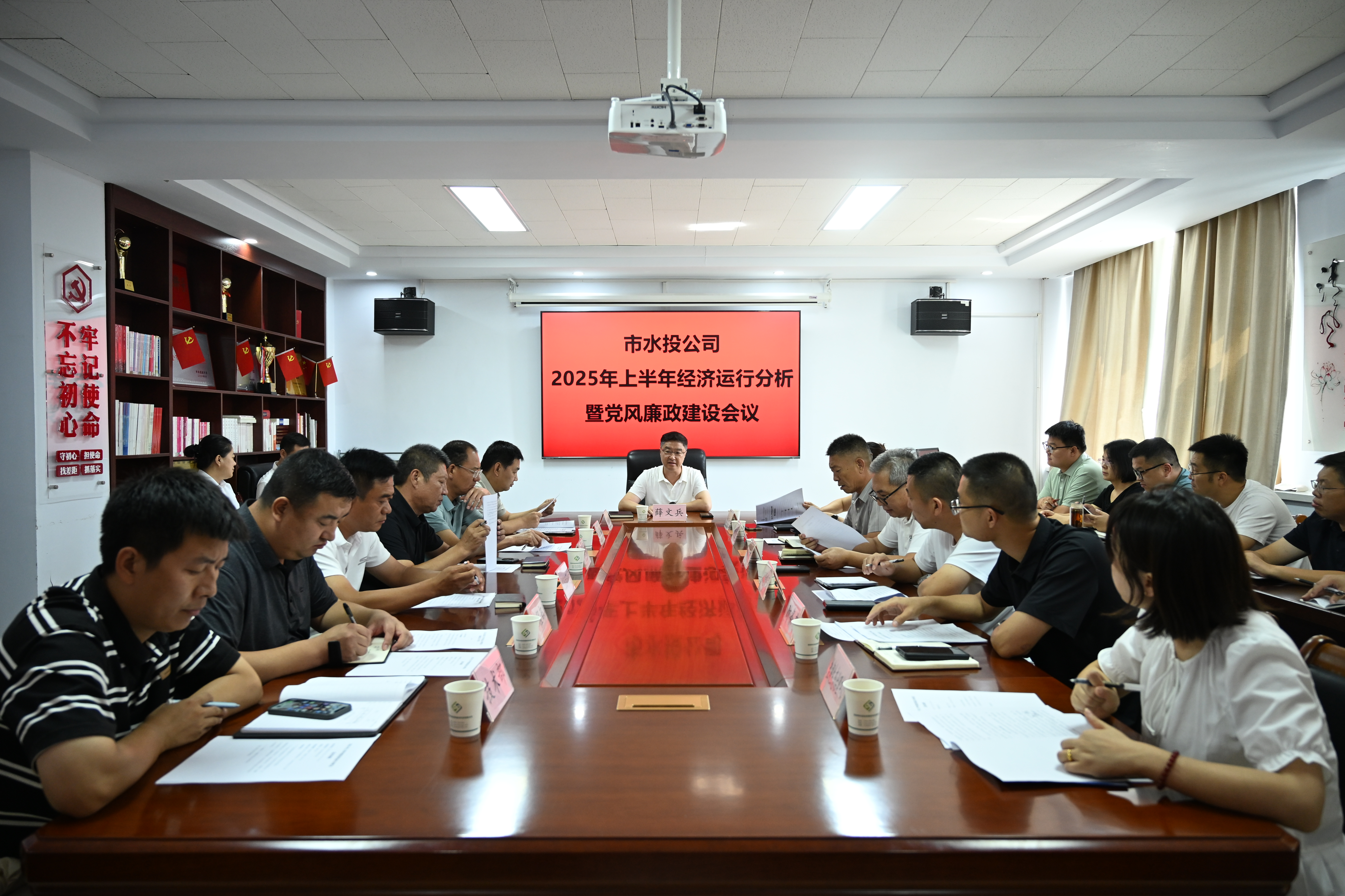 7月31日下午,市水投公司黨委書(shū)記、董事長(zhǎng)薛文兵主持召開(kāi)2025年上半年經(jīng)濟(jì)運(yùn)行分析暨黨風(fēng)廉政建設(shè)會(huì)議,總結(jié)上半年工作成效,研判經(jīng)營(yíng)發(fā)展形勢(shì),明確部署下半年重點(diǎn)任務(wù)。黨委副書(shū)記、總經(jīng)理?xiàng)钏仄剑h委委員、紀(jì)委書(shū)記尚曉文,公司董事郭龍,子公司班子成員、公司中層干部參加會(huì)議。相關(guān)部門(mén)及子公司匯報(bào)了工作情況。