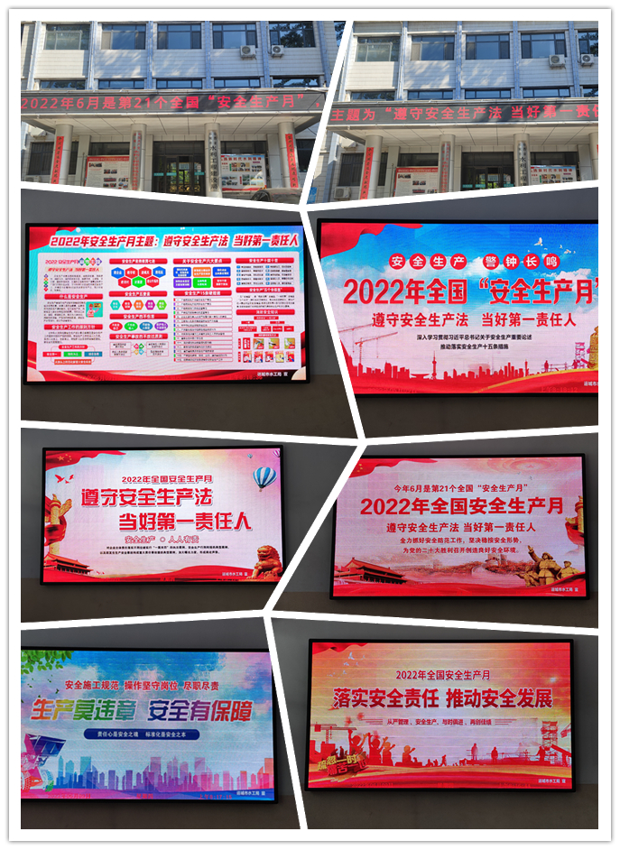 今年6月是全國(guó)第21個(gè)“安全生產(chǎn)月”,主題為“遵守安全生產(chǎn)法,當(dāng)好第一責(zé)任人”。為做好今年“安全生產(chǎn)月”的宣傳工作。近日,我公司通過(guò)門(mén)頭電子屏滾動(dòng)播放宣傳標(biāo)語(yǔ)、室內(nèi)電子屏展示安全生產(chǎn)知識(shí)、微信群發(fā)放最新版《中華人民共和國(guó)安全生產(chǎn)法》,時(shí)刻提醒公司全體員工遵守安全生產(chǎn)法,履行安全生產(chǎn)責(zé)任制。